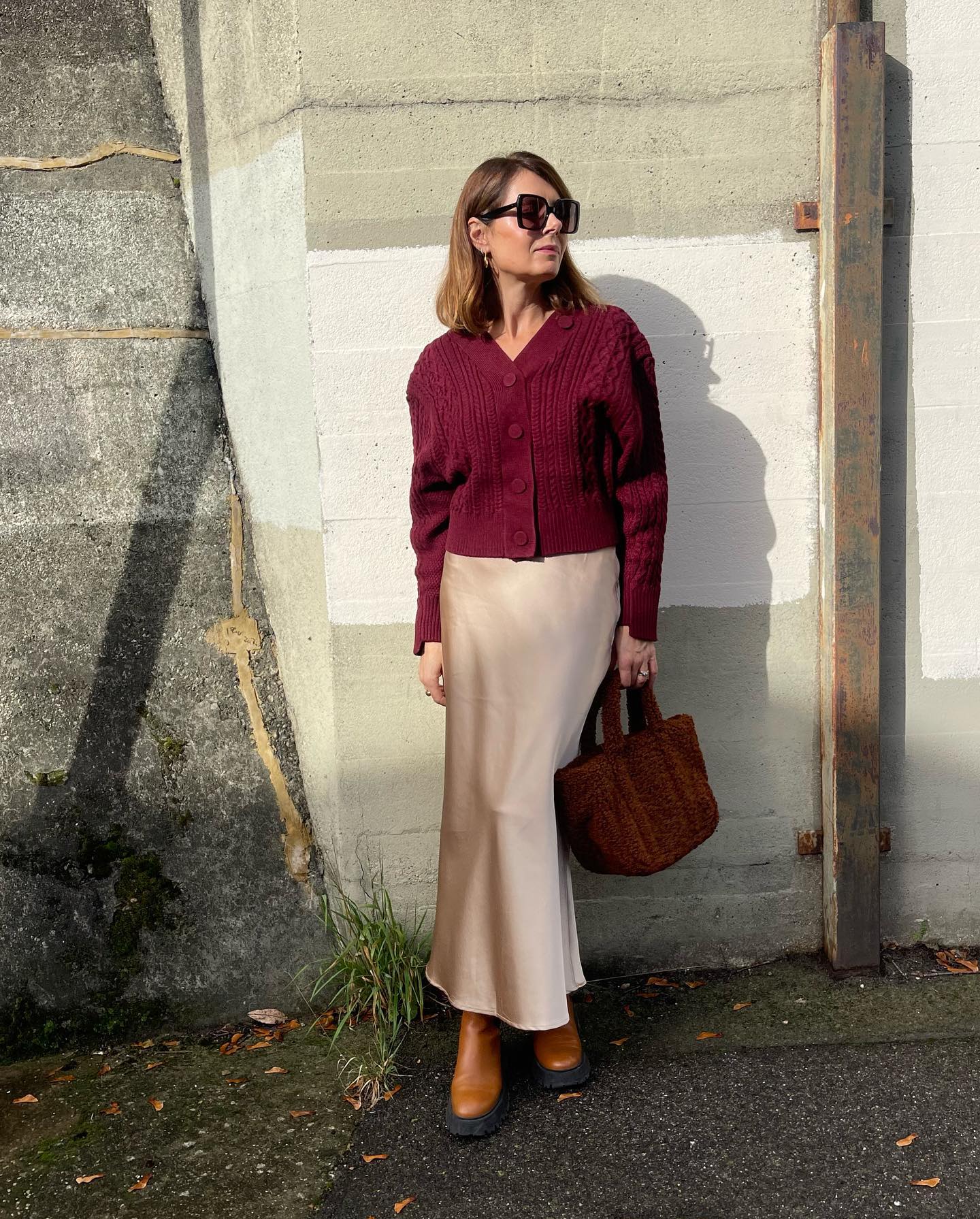 Stylist and content creator Claire Webber (@mintconditionlondon) took on this trend, pairing our burgundy chunky cableknit cardigan with a flattering silky maxi skirt for the perfect autumnal look. The neckline and subtle sleeve detail give this cardigan a unique touch to elevate your everyday looks, while the colour and shape are timeless, so you can style this piece over and over (and over) again. Steal Claire's styling tip and mix the chunky knit with a silky skirt (check out the navy drawstring style we recently dropped). To accessorise, keep it simple with an elegant vegan leather shoulder bag and a pair of classic black thick frame sunglasses.