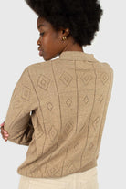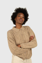 Beige patterned wool-blend knit polo top