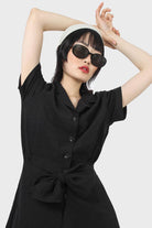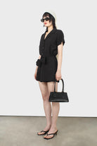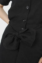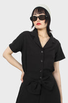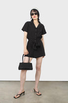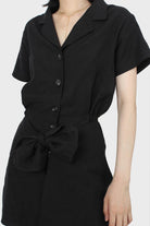 Black short sleeved button up tie waist romper