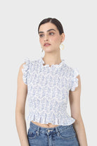 Ivory and blue floral print ruched tank