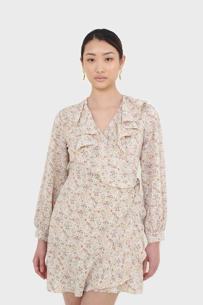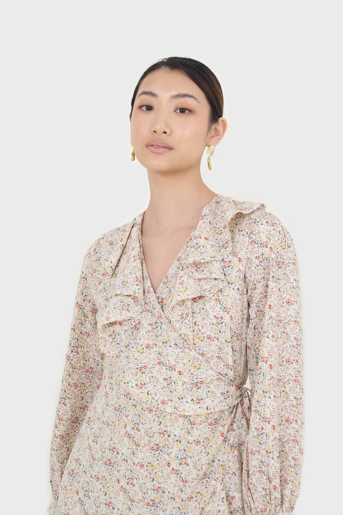 Ivory floral print ruffle trim wrap dress