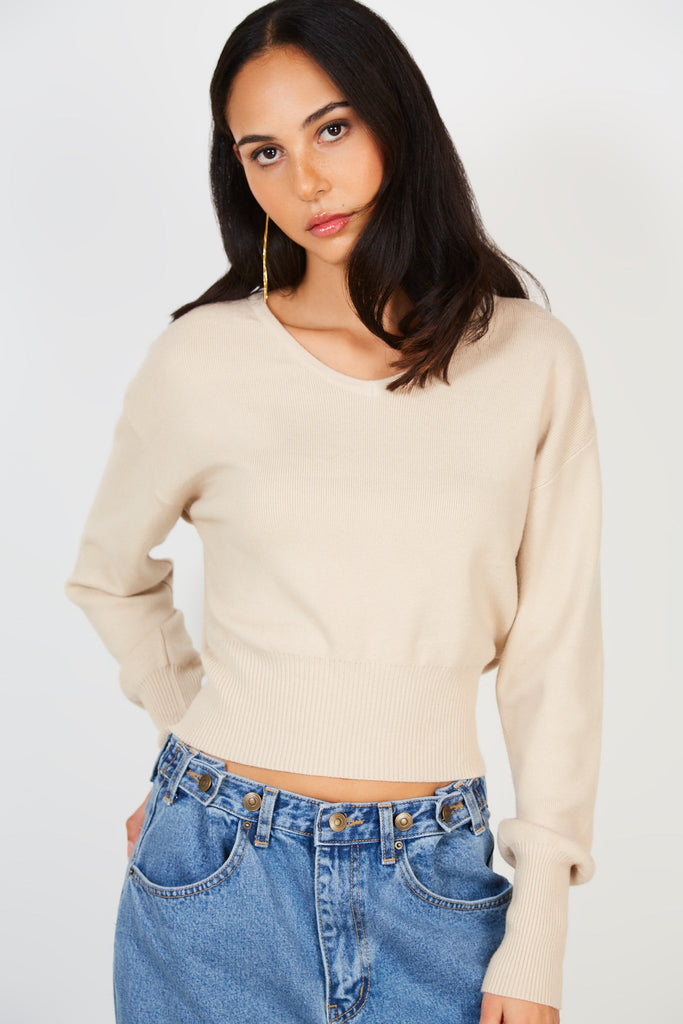 Beige smooth v neck jumper