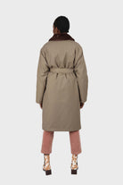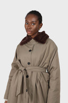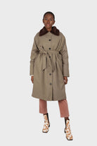 Khaki and brown faux fur collar contrast faux fur lined trench coat